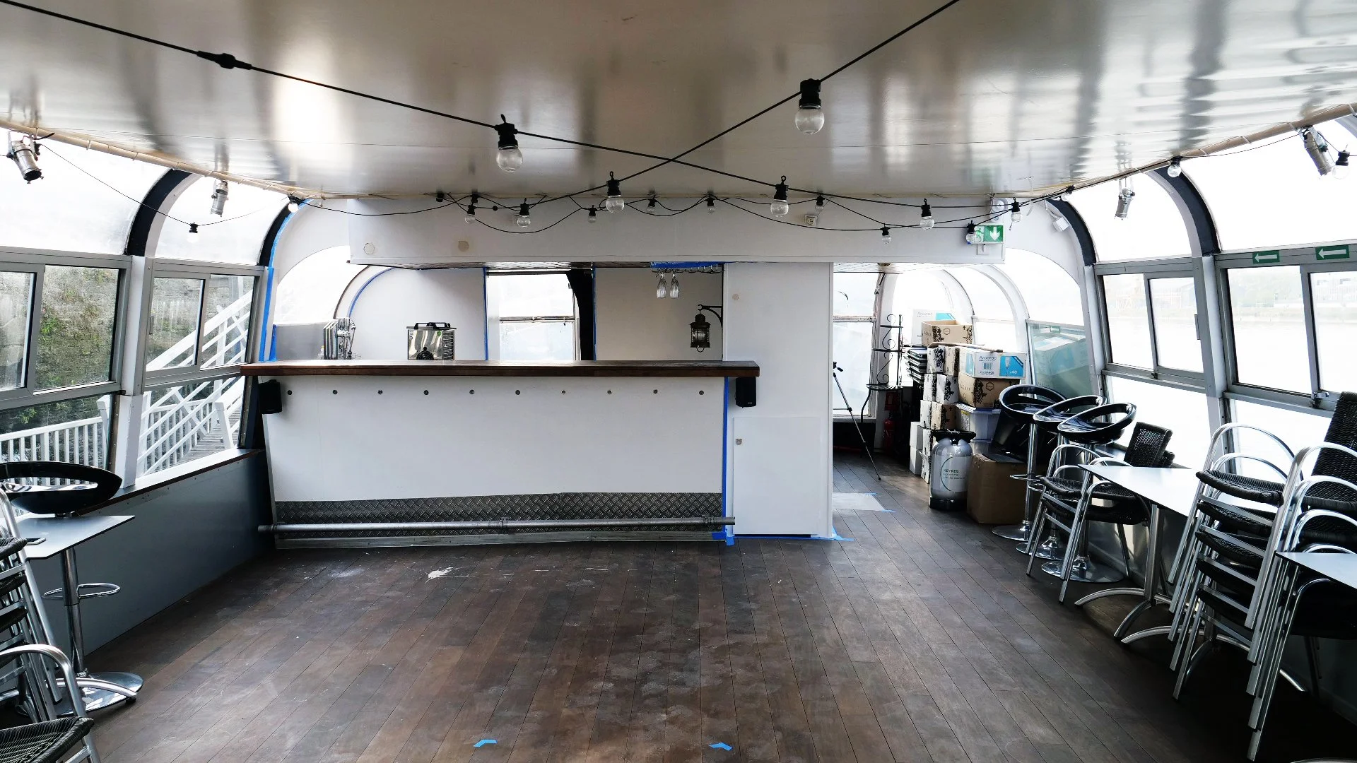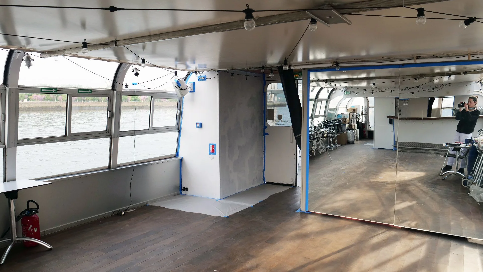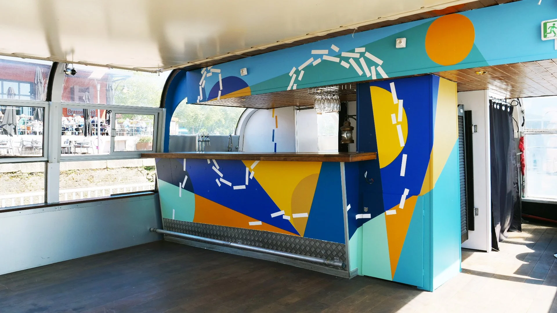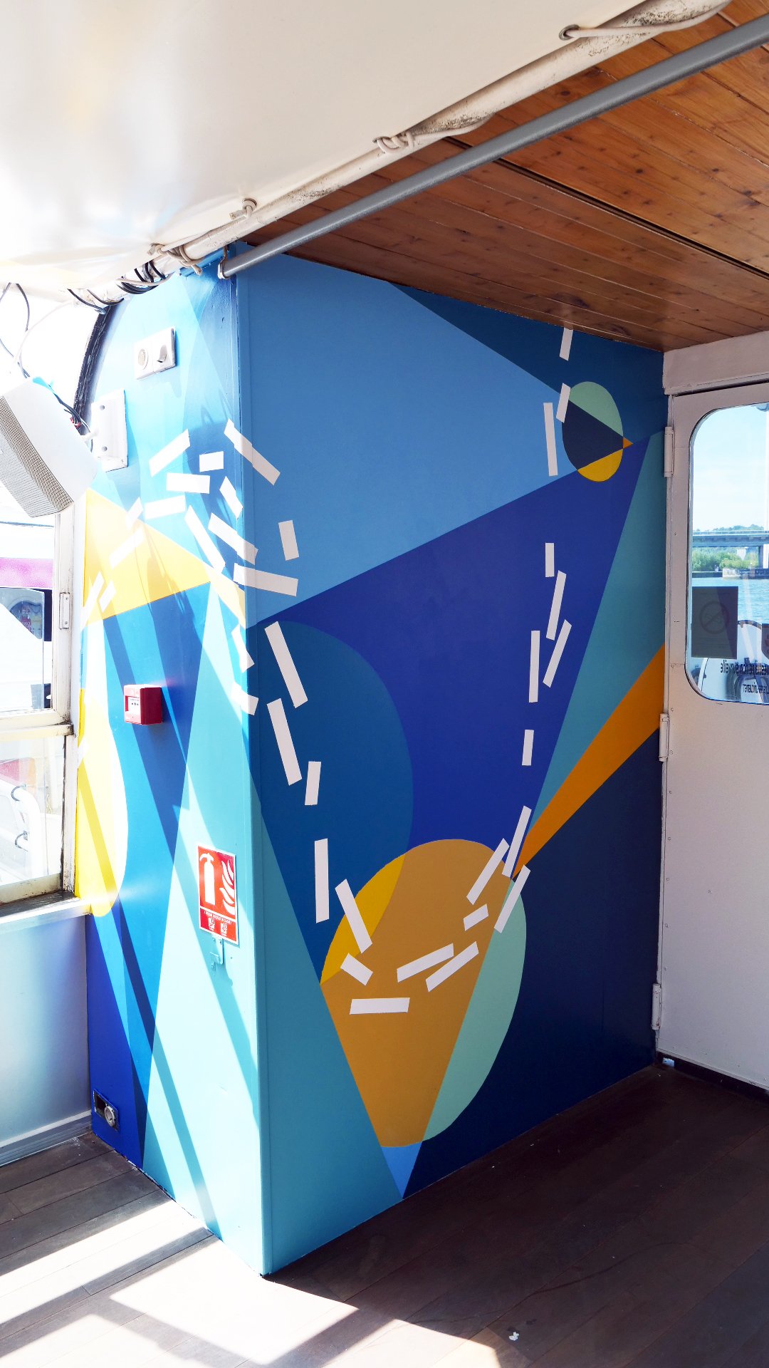 Le Lutèce est une péniche de croisière sur la Seine au départ de Rouen et un espace festif (soirées, concerts...). J’ai réalisé une peinture murale sur l’ensemble de la péniche (espace bar et entrée). Le motif de la peinture est inspiré de la courbe de la Seine aux alentours de Rouen, ains que du graphisme des cartes martimes (flux, symboles).
