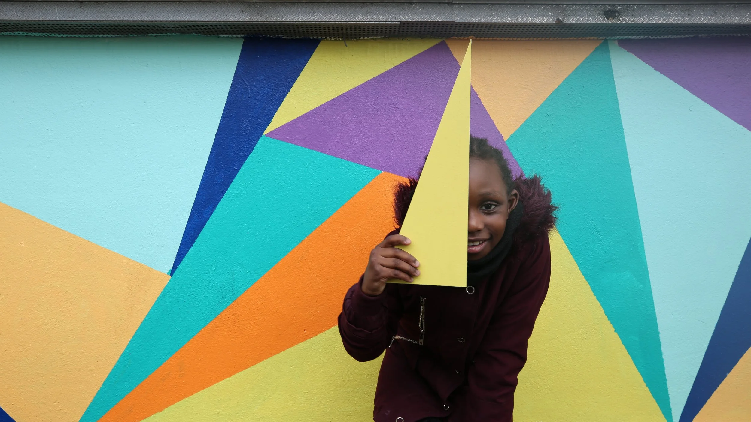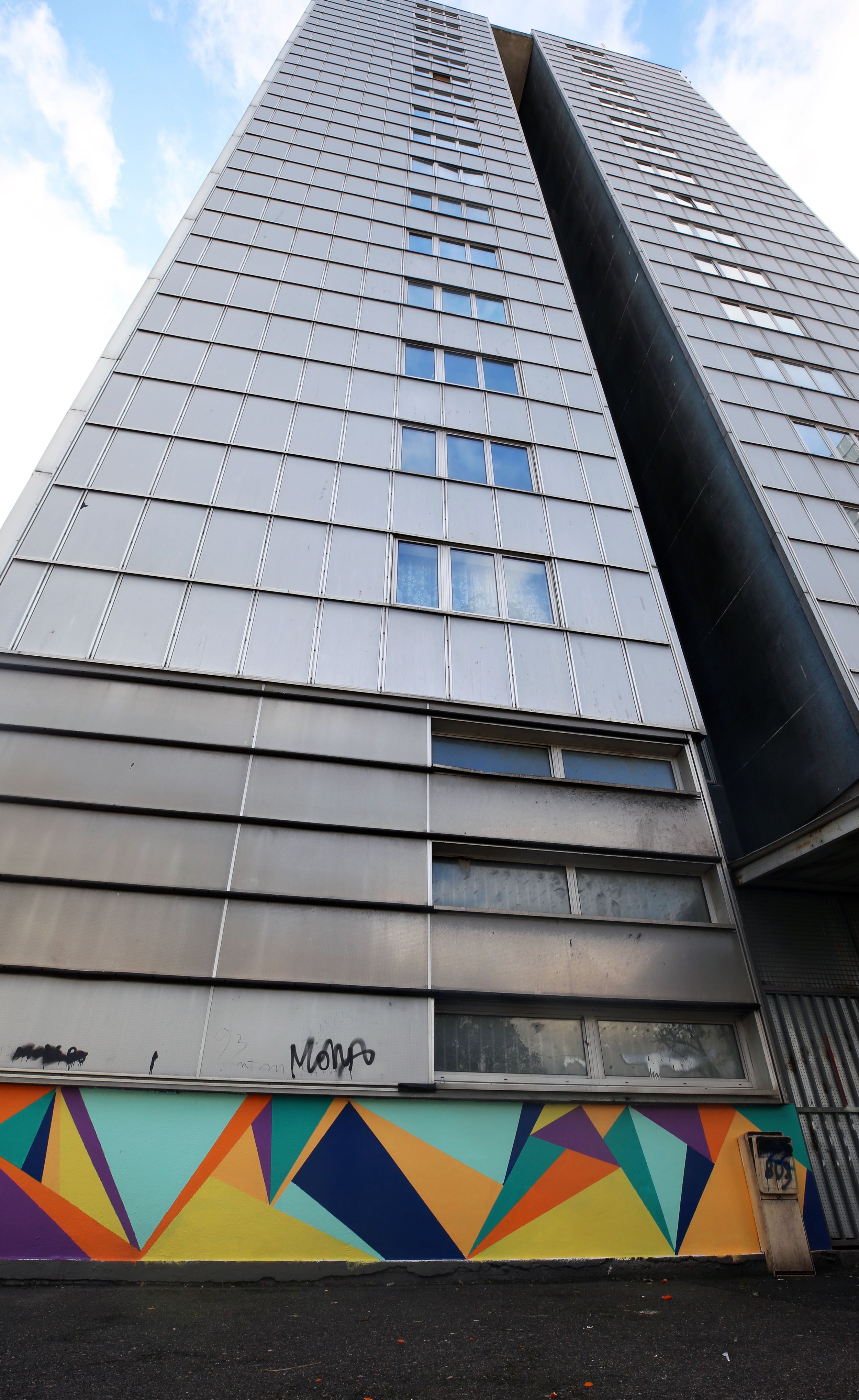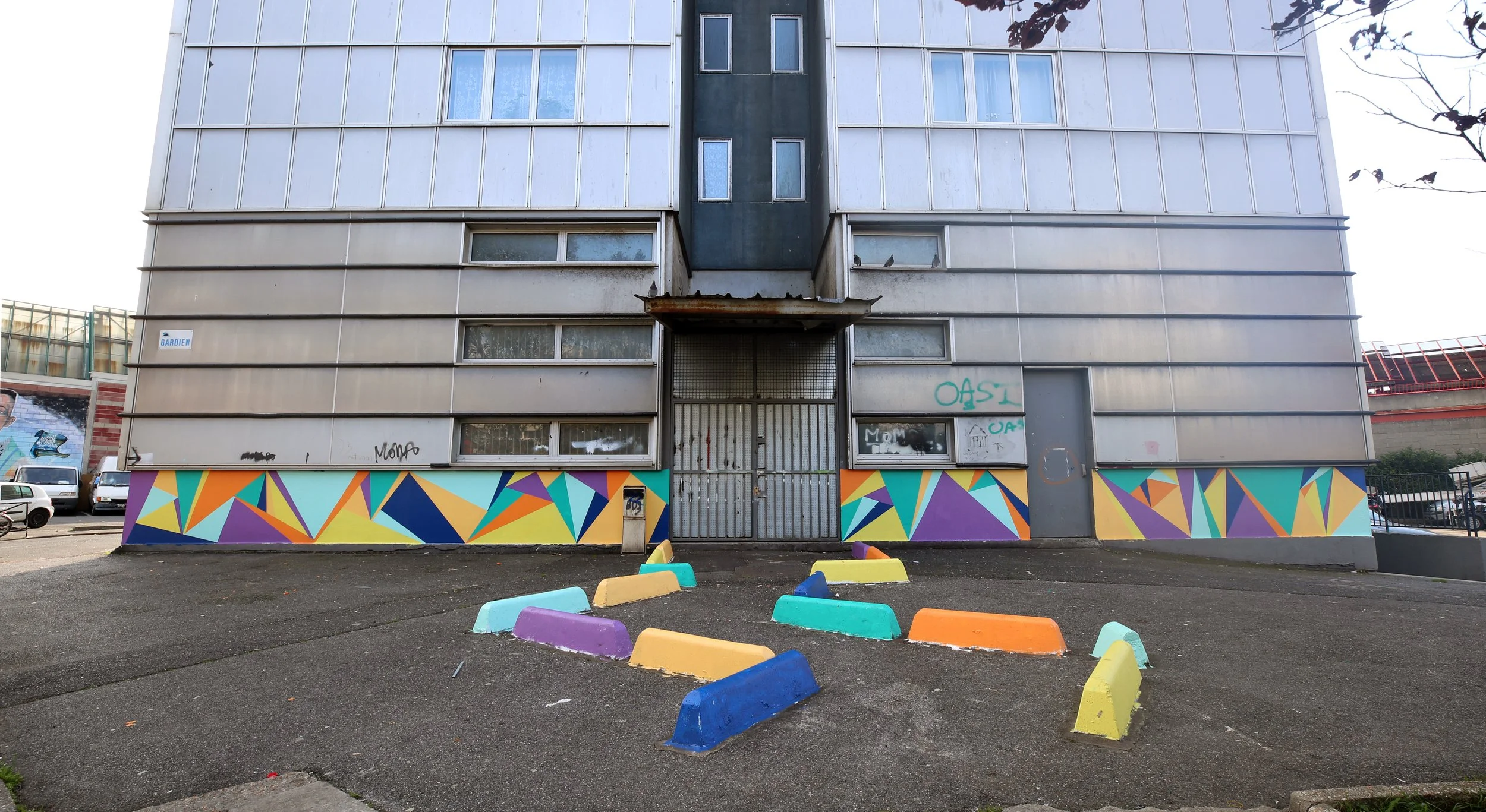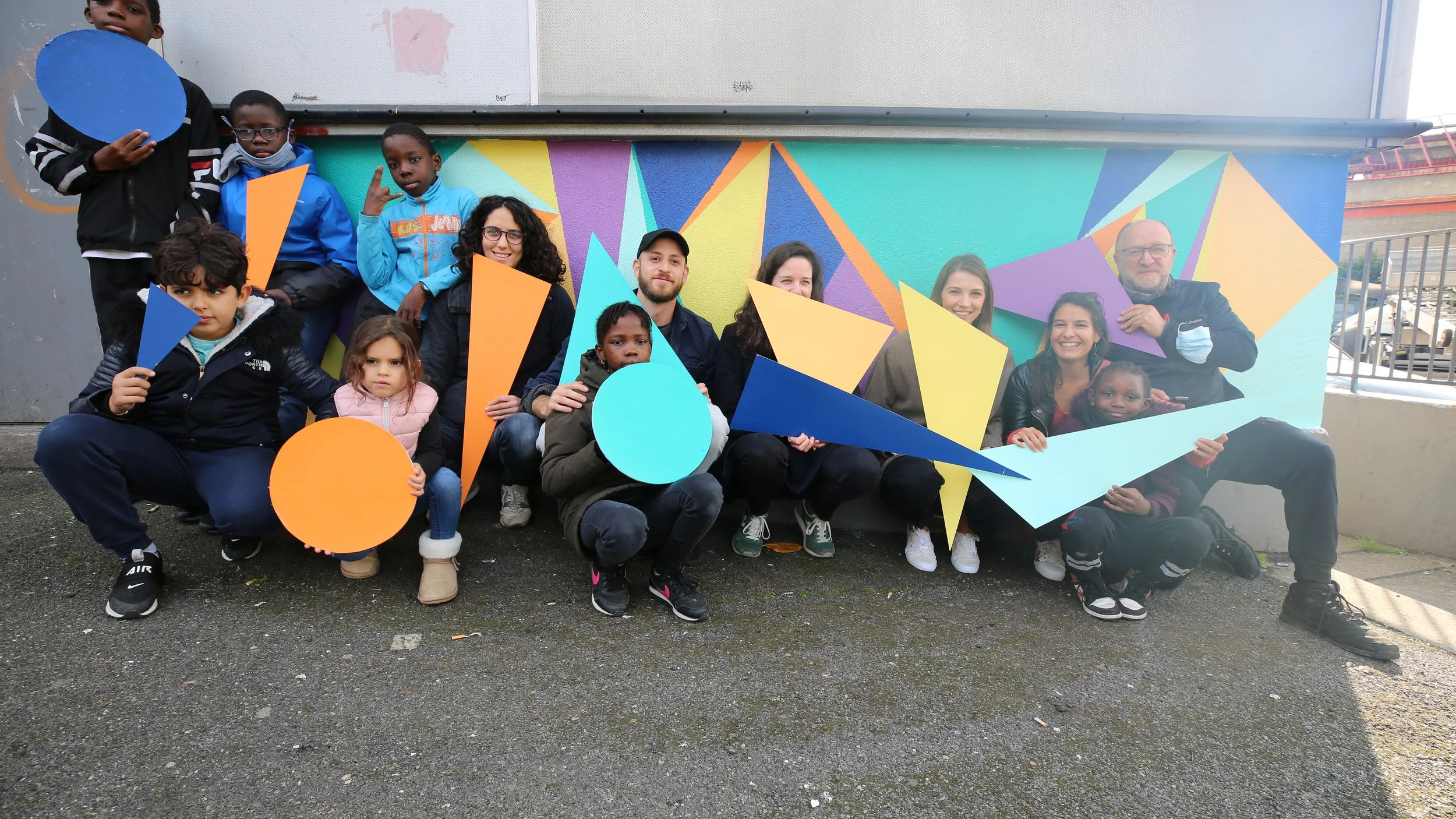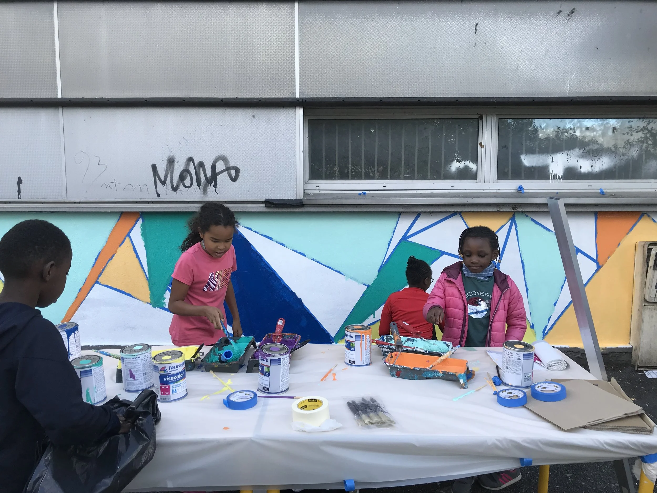Avec les enfants de la cité et les bénévoles de ATD Quart-Monde, nous avons réalisé une grande peinture murale en bas d’une tour. Les enfants ont aidés à la réalisation puis ont poursuivi par un atelisuer de photographie (avec le réalisateur Eden Shavit). Des formes colorées identiques à celles peintes sur le mur leur ont été donné afin qu’ils puissent jouer et composer avec la peinture murale et l’exercice photograpique.