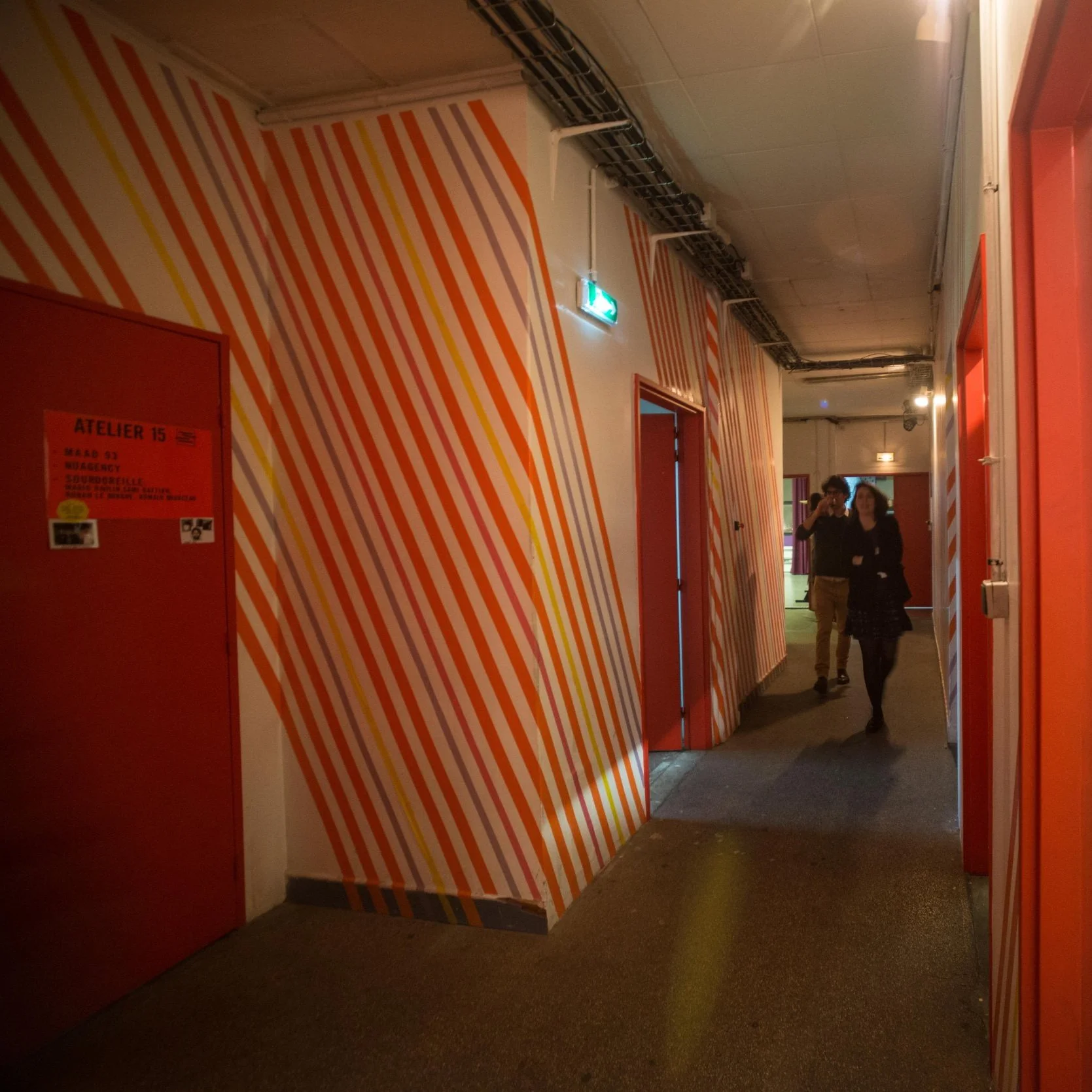«Innerspace» est une installation immersive réalisée en scotch de couleurs pour la soirée anniversaire de Mains d’Oeuvres, lieu pour l’imagination artistique et citoyenne à Saint-Ouen. La signalétique est restée de façon pérenne dans le lieu et a été un élément de signalétique du lieu pour de nombreux évènements.
