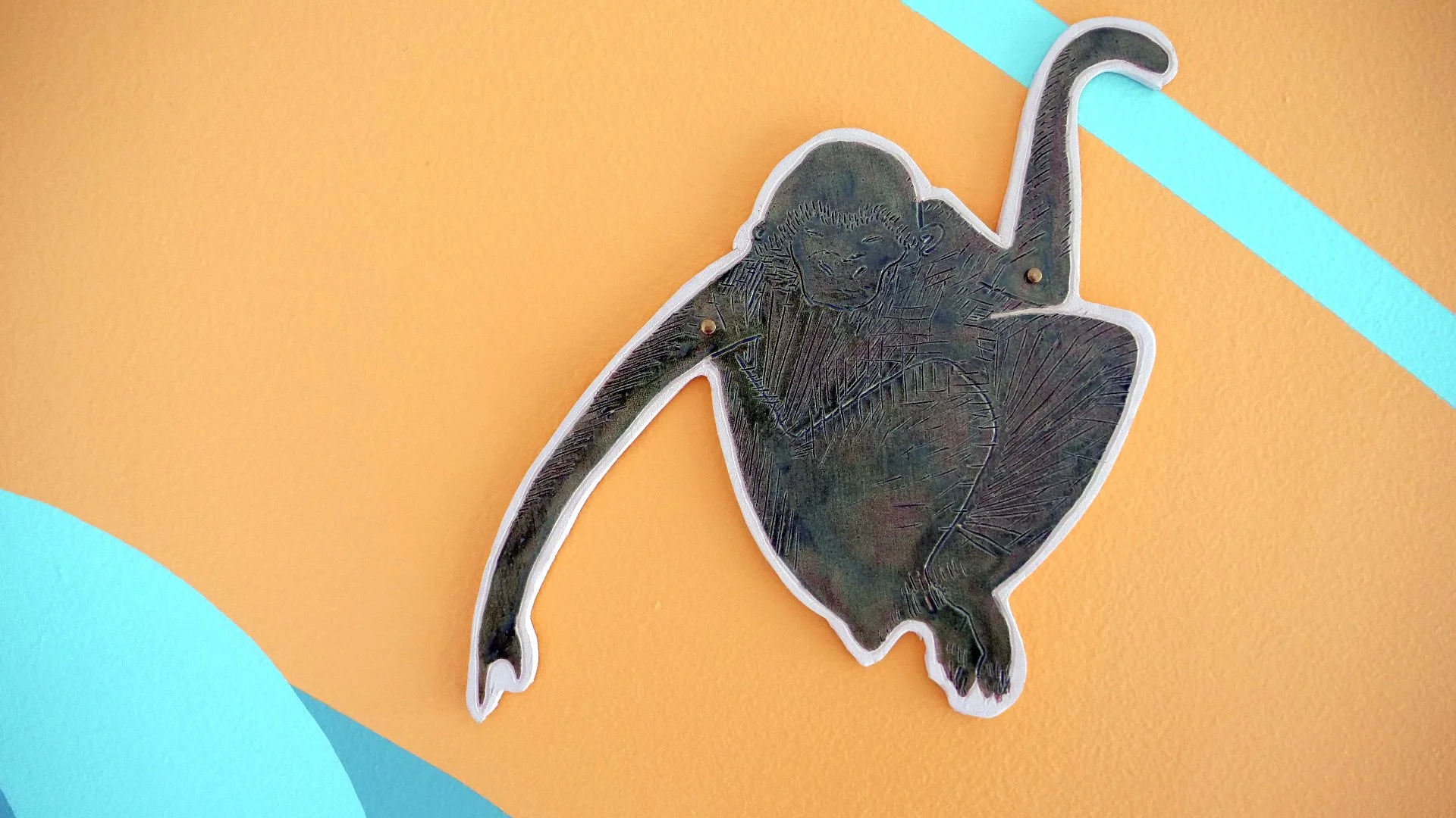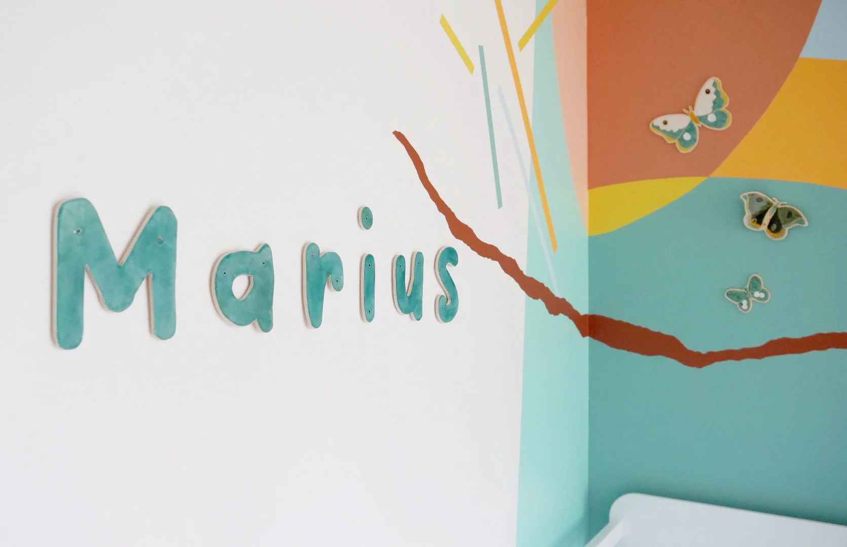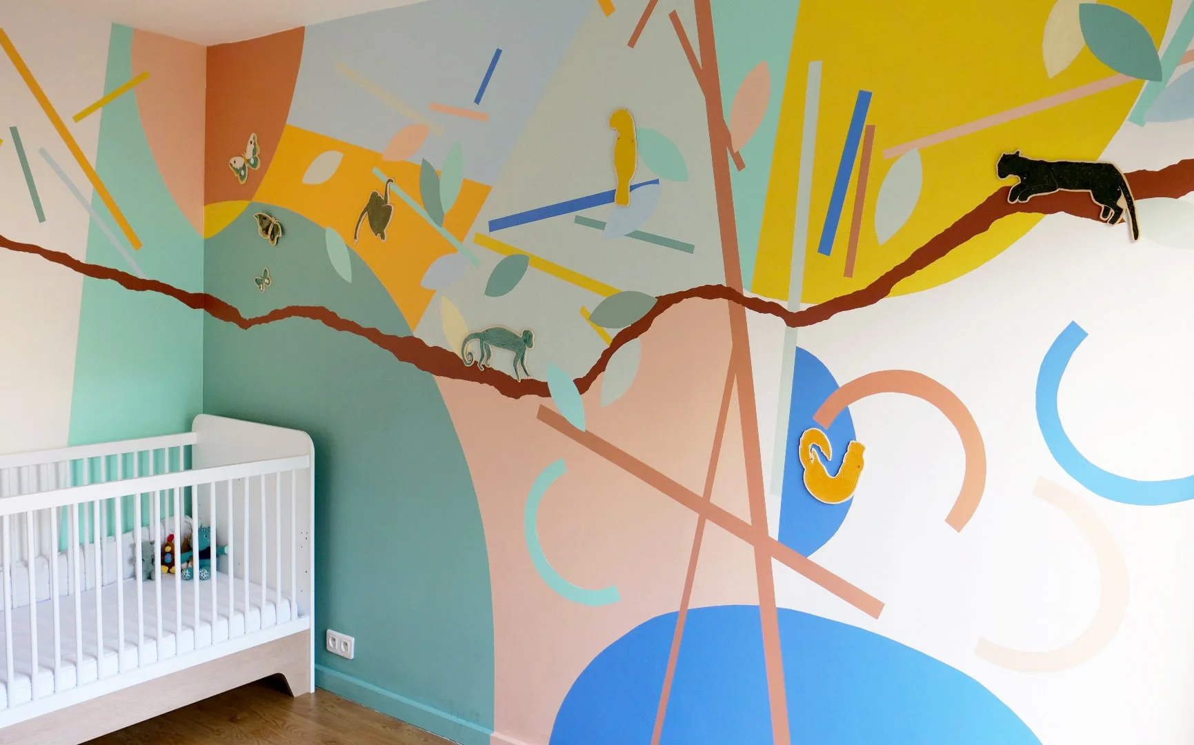 Peinture murale pour une chambre de bébé. Des animaux en céramique donnent vie aux couleurs et formes peintes.