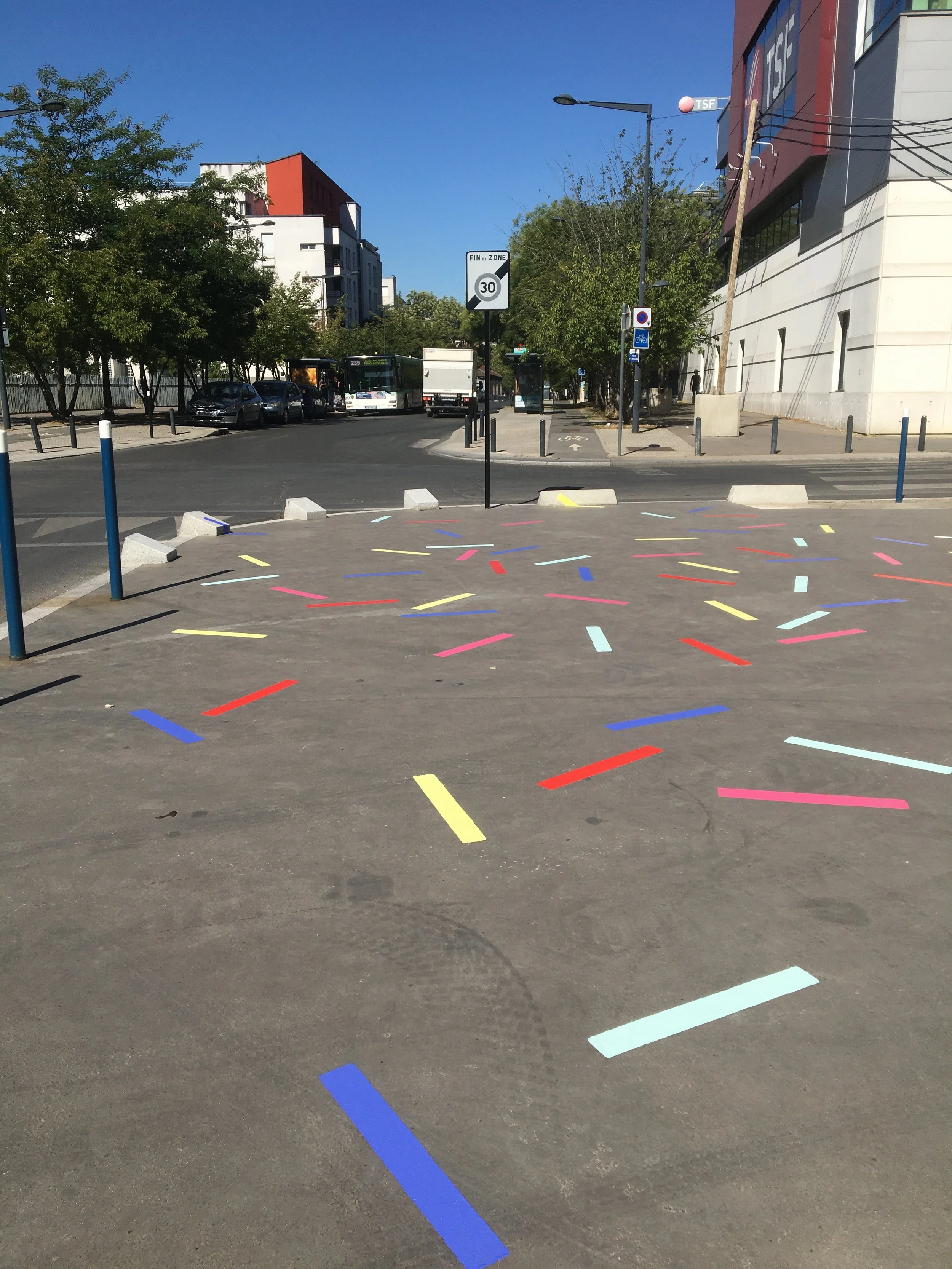 Dans l’attente du futur tram, la ville d’Aubervilliers, Plaine Commune et La fabrique des impossibles se sont associés pour occuper la rue, dynamiser l’espace public et permettre aux habitants nouveaux et anciens de se rencontrer. Le projet de signalétique au sol réalisé sur la totalité de la rue des Fillettes, permet une liaison entre Paris et Aubervilliers, entre l’ancienne et la nouvelle ville, et est surtout un marquage du territoire en pleine transition. Cette signalétique amène à la déambulation, au jeu et une traversée ludique de la rue.