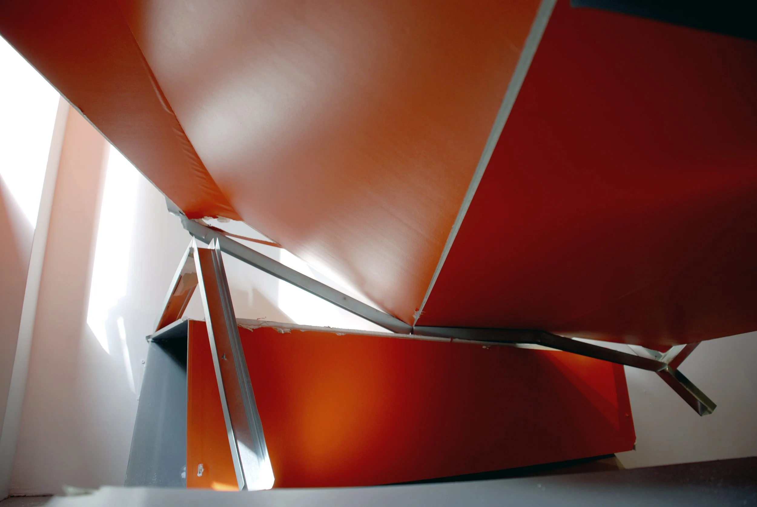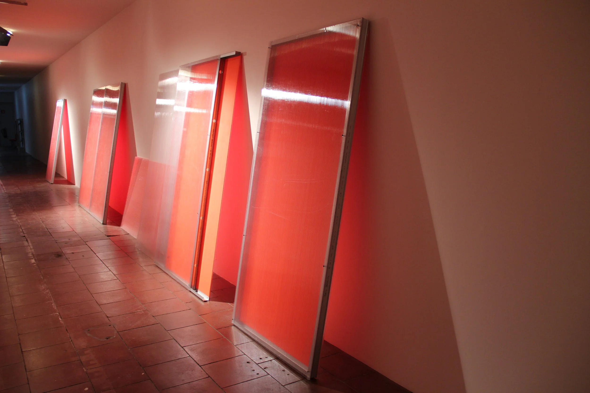 À travers (orange), 2019 - Polycarbonate, rail métallique, peinture Installation in situ - La Vallée, Bruxelles